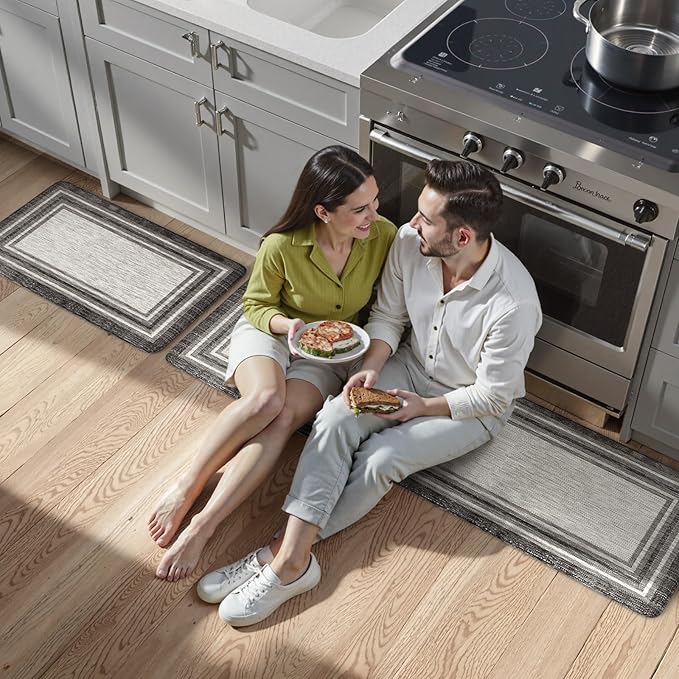 - Comfort Anti-fatigue Kitchen Mats: 0.47inch (12mm) extra thick anti fatigue kitchen floor mat are sure to provide cushion on your feet, knees, lower back, and joints for standing.Feel comfortable like walking on a firm but soft cloud when you are cooking in kitchen or working at your standing desk