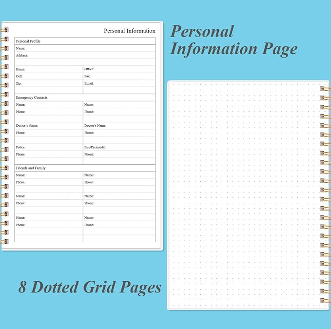 - A5 SIZE - This undated daily organizer size of 8.5 x 5.8 inch, perfect size to fit in your bag.1 quick reference page, contact pages, important dates page, and 75sheet (150 page) daily plan & notes,8 dotted grid pages, Undated appointment planner makes it easy for you to start the planner at any time.