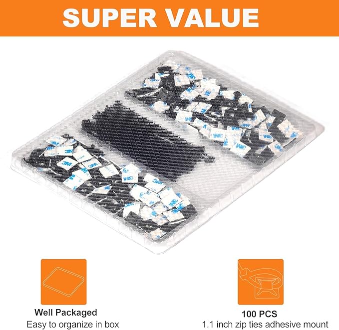 - 【Slim Fit and Innovative Design】:This Zip Tie Adhesive Mounts is 1.1 inch and is basically suitable for any place. It is composed of 100 pack cable ties and 100 pack cable mount. You can use cable ties to fix some cables alone, or you can combine the fixing brackets to fix. It has the latest creative design. More practical! It can be locked by adjusting the sliding band, and the carefully designed sliding mode makes it more flexible and effective when used.