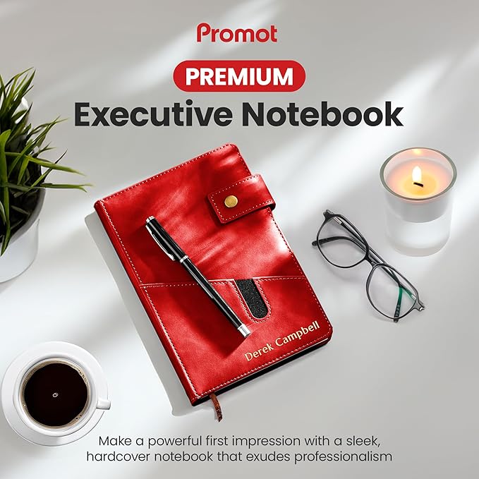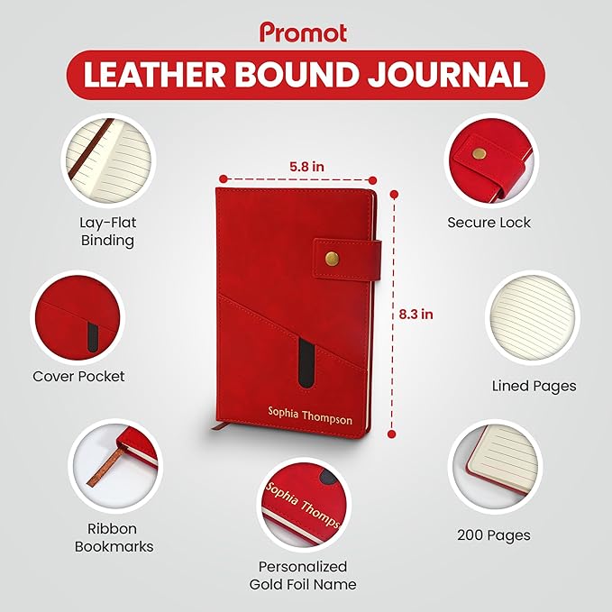 Promot Personalized Notebook - A5 Lined Leather Bound Journal for Writing Women Men - Hardcover Executive Notebook, Daily Journal, Travel Diary, Gift Idea, Custom Embossed Text with Gold Metallic Foil