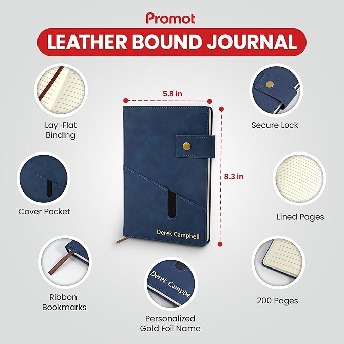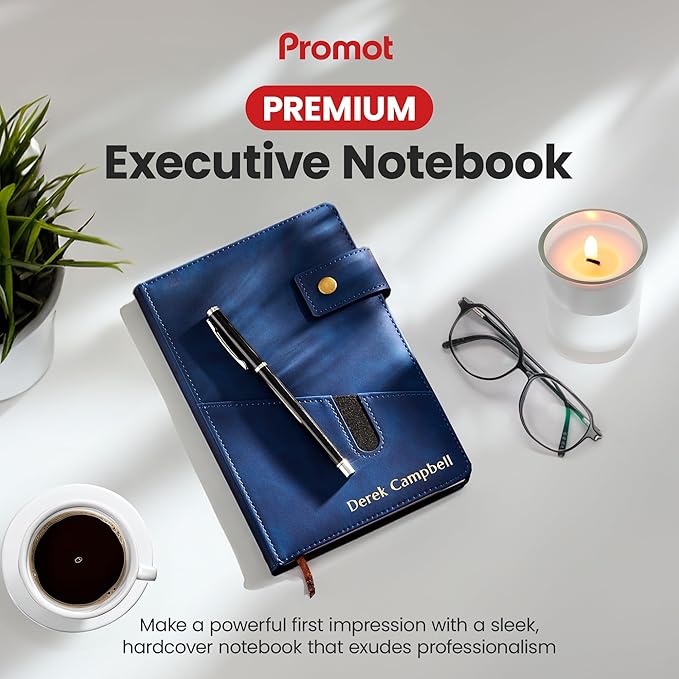 Promot Personalized Notebook - A5 Lined Leather Bound Journal for Writing Women Men - Hardcover Executive Notebook, Daily Journal, Travel Diary, Gift Idea, Custom Embossed Text with Gold Metallic Foil