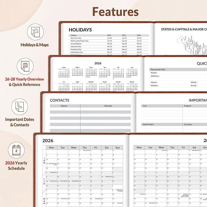 - Additional Features - The weekly planner includes 2026-2028 calendars, holiday lists, contact pages, notes pages, important dates, and US time zone map.