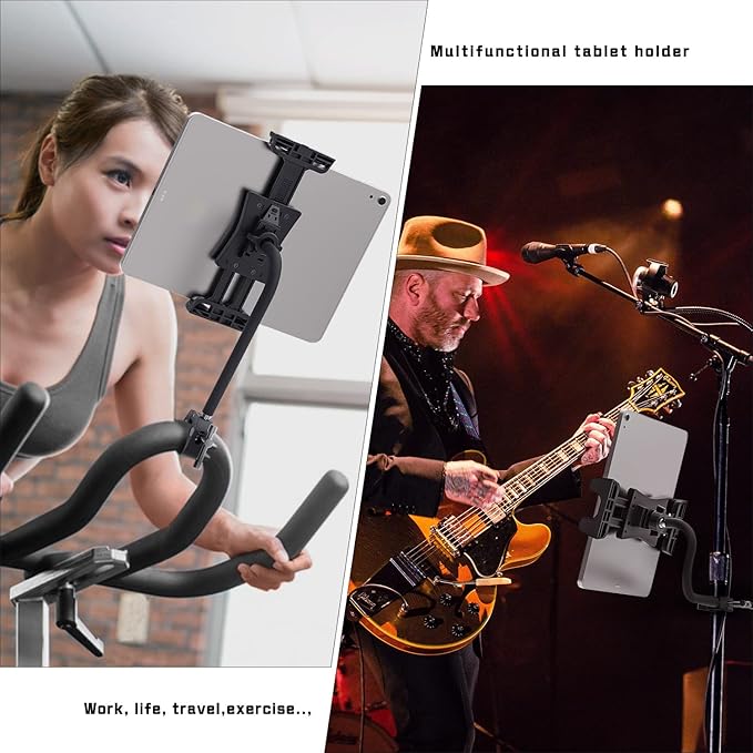 Tablet Holder for Treadmill, Gooseneck Spin Bike & Peloton Handlebar Tablet Clamp Mount Compatible with 4.7–12.9" Tablets, Perfect for Home Gym, Exercise Bike, Stroller, and Indoor Cycling