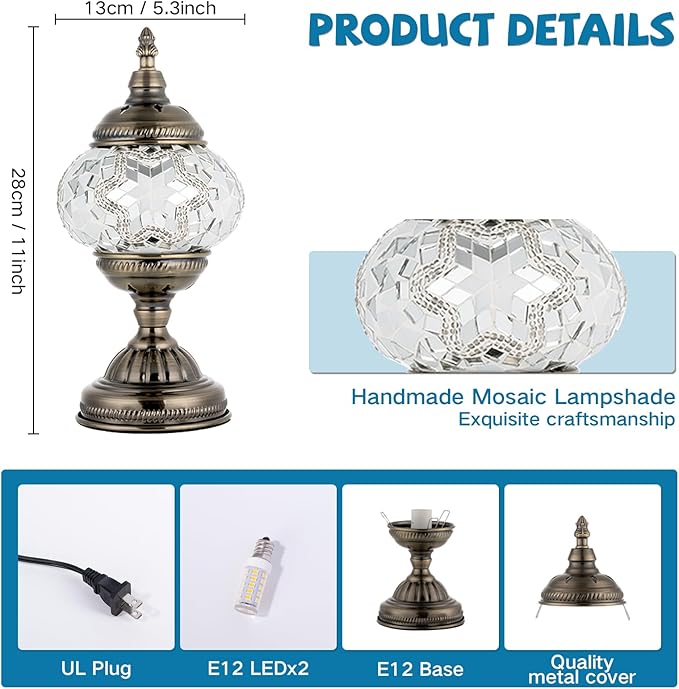 Turkish Moroccan Table Lamp Lantern with Handmade Mosaic Glass Lampshade Tiffany Style Bohemian Stained Glass Decorative Desk Lamps Bedside Night Lights for Bedroom (White 2)