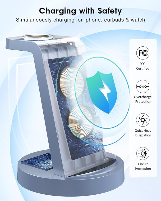 - 【Safety Fast Charging】Equipped with A 18W fast charger and 3.3ft type-c charging cable, enable fully charge in just 2 to 3 hours,get a boosted at 30% faster than other iphone wireless charger. Besides,with advanced FCC approval,our 3 in 1 charging station uses the latest chip to boost efficiency and improve heat dissipation,and provides temperature control and voltage protection,and short-circuit prevention.There are cooling holes on the back,no need to worry it gets extremely hot.