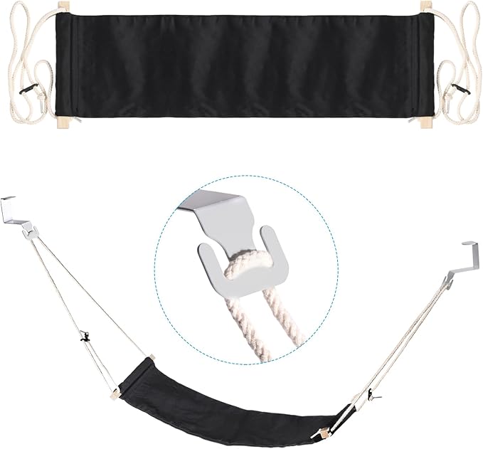 - Instruction: Place the hooks on both ends of the table edge. Attach the foot rest hammock to the hooks by looping the straps through the hooks and adjusting the tension until the foot swing is secure. Adjust the tension and height to your need for maximum comfort.