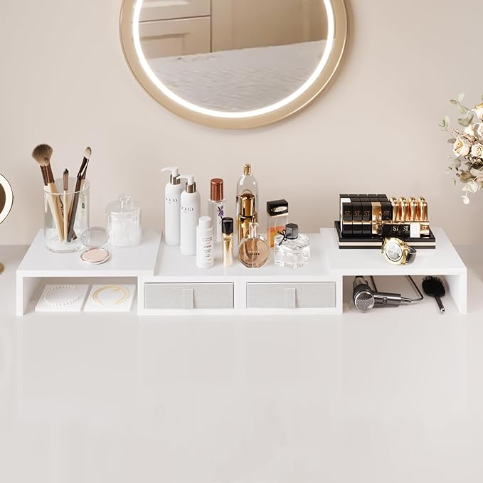 TEAMIX Dual Monitor Stand Riser - Length and Angle Adjustable White Monitor Stand with 2 Drawers to Storage Large Computer Riser for 2 Monitors/Laptop/PC, Wood Screen/TV Stand Desk Organizer (White)