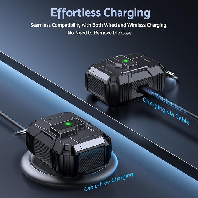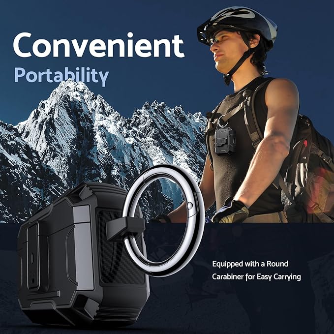 - 【Convenient Charging & Portability】The case supports both wired and wireless charging for your AirPods Pro case. The front LED remains visible to show the charging status. An included portable carabiner allows you to conveniently take your AirPods Pro case with you during outdoor activities like climbing, hiking, and travelling.