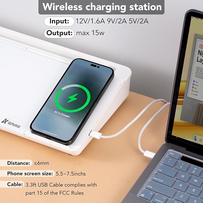 - Wireless Charge Station: This desk glass white board with wireless charger stand makes it very convenient to charge your compatible devices safety without additional cables or adapters. The accessary 3.3ft USB Cable complies with part 15 of the FCC Rules