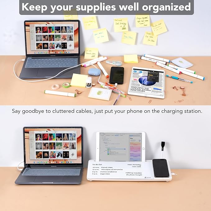 - Multi-functional Design: Sitting compactly between your monitor and keyboard, you can use it as a desk to do list whiteboard, or phone charger, or phone/tablet holder, or keyboard stand. It can used for your office task organization, family schedule and workout plan