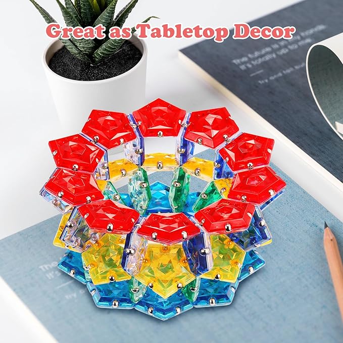 - [Develop Your Spatial Thinking]: Fold, shake, spin and stack the pieces. Connect the pentagonal plates together into sculpture-like forms. Click and clack the pieces around in a satisfying symphony of kaleidoscopic visuals. Flick your fingers like twisting tendrils as the magnetic ball transmogrifies your mind. Captivating 3D art!