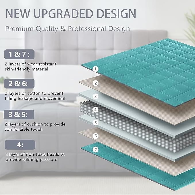- Cozy Microfiber Heavy Blanket: The material of teal blanket is microfiber polyester, which is stronger, more elastic & comfortable. The heavy blanket contains environmentally friendly glass beads, which are breathable & tasteless. With a dense stitching pattern interweaving into a 7-layer structure, the beads stay intently inside the compartments without scattering, while allowing for increased breathability through the blanket, great for the hot summer nights.