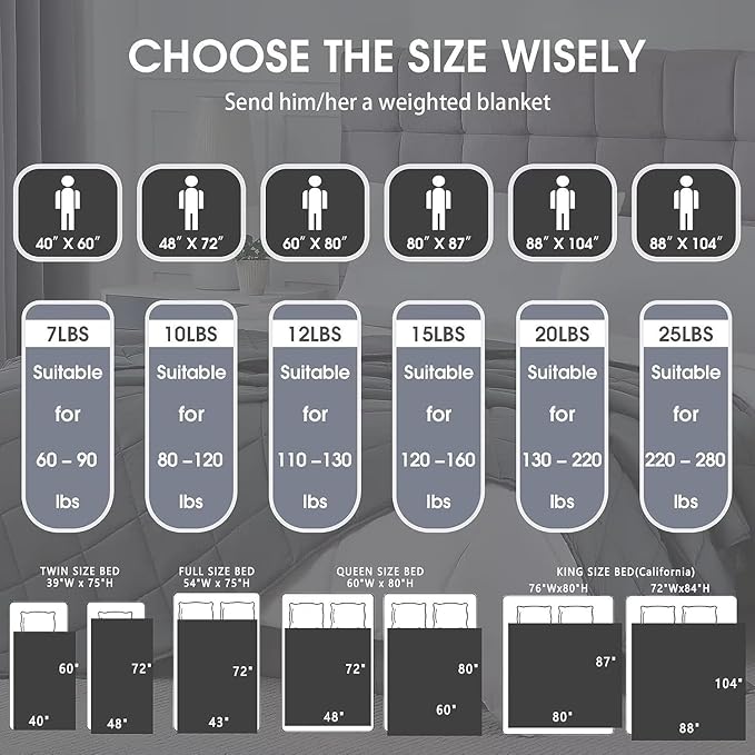 - CHOOSE RIGHT SIZE: As a weighted blanket, adults would be relieved by the warmth hug provided by its gentle pressure of evenly distributed glass beads of without soreness in muscles and bones. Choose the right size to get a comfortable experience. Research recommends the weighted blanket should be a minimum of 10% of yours weight. If you are trying for the first time, a lighter heavy blanket is more suitable.