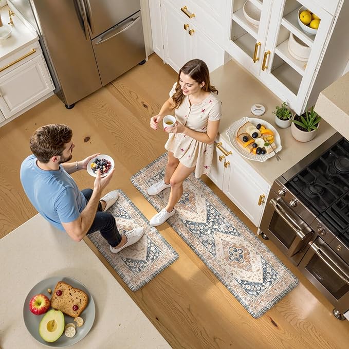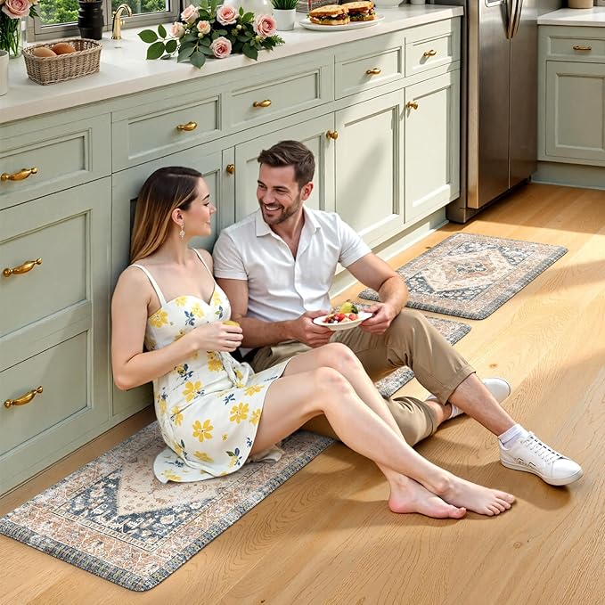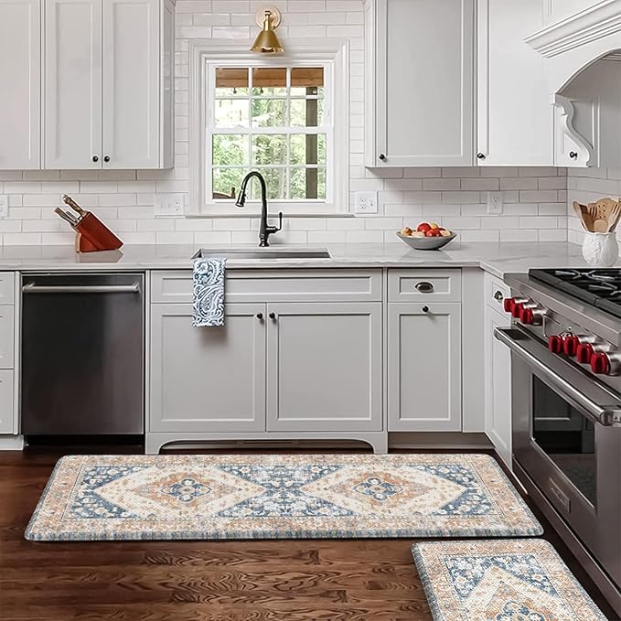 - Versatile: Vintage farmhouse style kitchen rug design features a central medallion and floral motifs in the style of Oriental rugs,easily to match your kitchen decor,bright your home.Soft thick foam provides ample support for standing in kitchen sink,laundry room, office,bathroom,dinning room,or any other high-traffic area