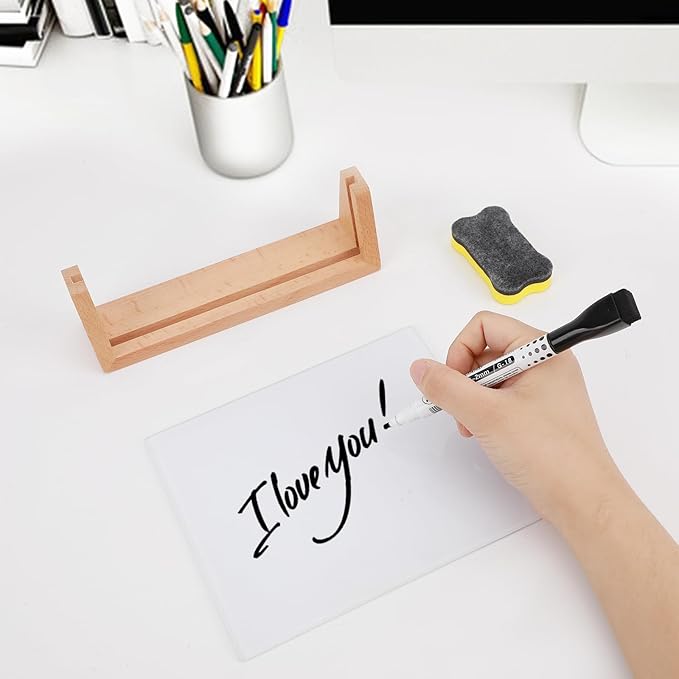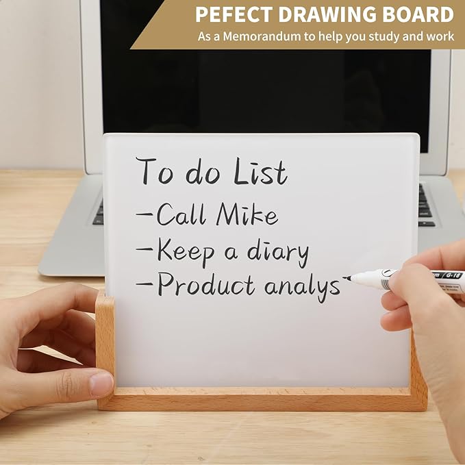 - High-Quality Craftsmanship - This desktop glass whiteboard with wooden stand is meticulously handcrafted using ultra-clear tempered glass, with great attention to detail. It is not only aesthetically pleasing but also non-toxic, eco-friendly, and durable, making it perfect for daily use. Elegant Design - This desktop dry erase board is designed with a chic U-shaped base, which makes it look elegant, stylish and stable, suitable for use in offices, homes, kitchens and any commercial environments.You can take the board off and write.