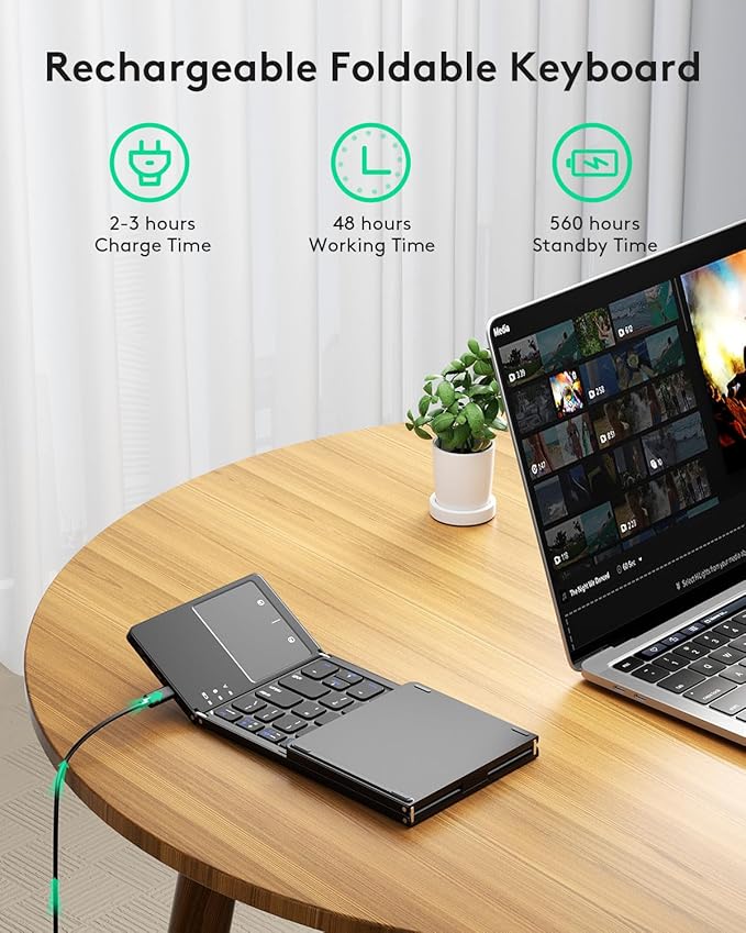 - 【Sensitive Touchpad Foldable Keyboard】Upgrade sensitive touchpad supports mouse left and right key function, so you can control the device without using mouse. Updated richer and more practical multimedia shortcut functions make your work more convenient and more efficient! Built-in rechargeable battery can last for 48 hours or 560 hours after 2-3 hours of charging. One full charge last enough for your short business trip or vacation!