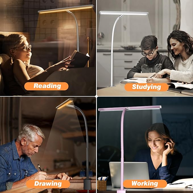 - Stepless Dimming Mode: The desk light offers effortless switching of color temperatures (2700K-6500K) and stepless dimming (1% - 100%) to meet your arbitrary color temperature and brightness needs, providing you with a healthy and comfortable office lighting experience. It is perfect for you and your child to read, work, study, unwind, draw, knitting, sew, craftwork, etc