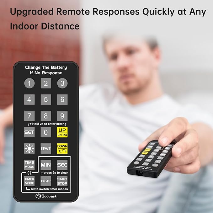 - ๐ฆ๐ฒ๐ป๐๐ถ๐๐ถ๐๐ฒ ๐ฅ๐ฒ๐บ๐ผ๐๐ฒ - Soobest digital Calendar clockโs remote has a very clear instruction and functional division, which make less confusion when you using the remote. And the sensitivity of remote will not let you down at the indoor distance. (Remote could not set alarm).