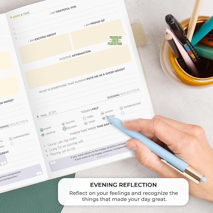 - YOUR DAILY DOSE OF POSITIVE THINKING – This daily journal with prompts requires just 4 minutes a day and helps you focus on the good, practice gratitude and affirmations, and be mindful of your feelings and emotions.