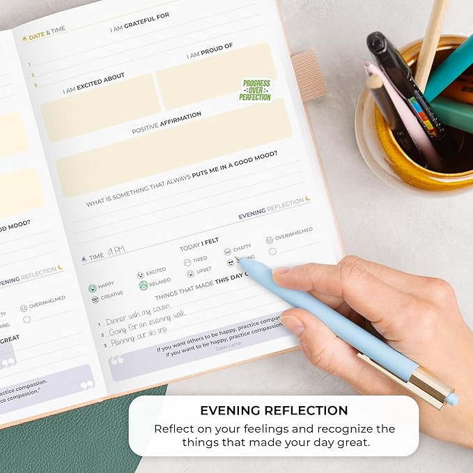 - YOUR DAILY DOSE OF POSITIVE THINKING – This daily journal with prompts requires just 4 minutes a day and helps you focus on the good, practice gratitude and affirmations, and be mindful of your feelings and emotions.