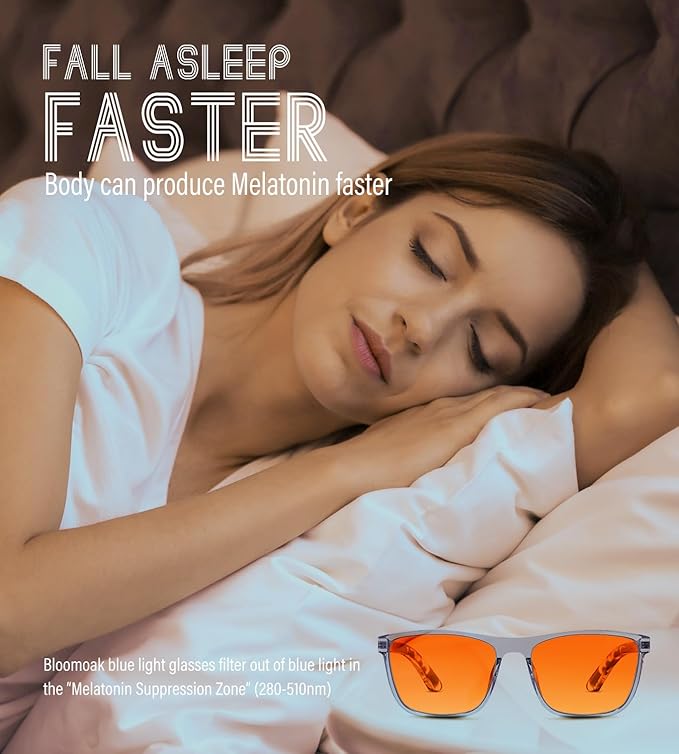 - Blocking Blue Light for Better Sleep: Blue light exposure before going to bed has been proven not only to make falling asleep more difficult, but also to reduce the quality of sleep recovery.By using bloomoak Amber glasses before going to bed, you can fall asleep like a baby again, and wake up refreshed.
