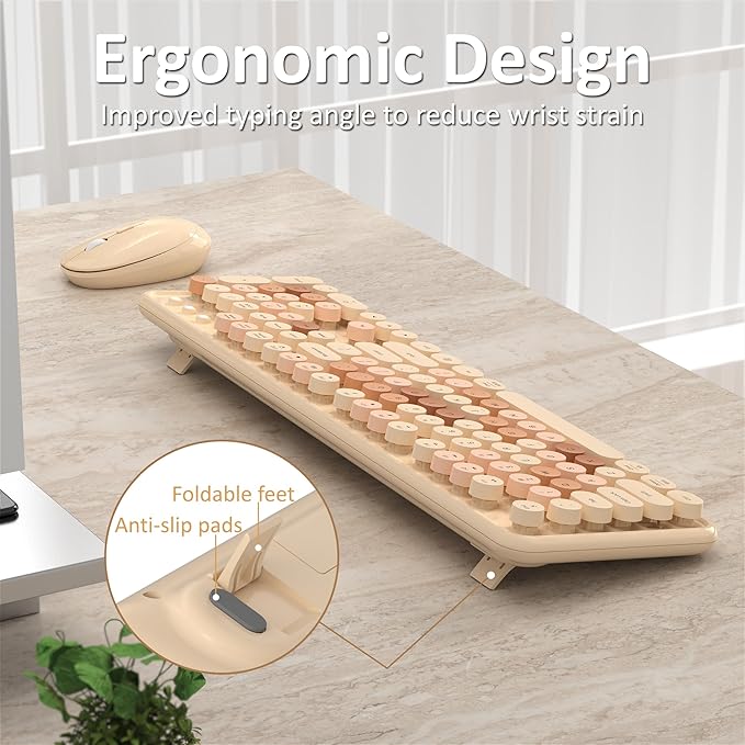 Wireless Keyboard and Mouse, Full-Size Retro Typewriter Keyboard with Round Keycaps, 2.4GHz for Windows, Mac, Laptop, PC, Desktop (Milky Tea Colorful)