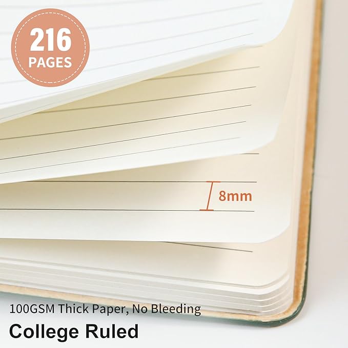 - 【216 Pages Of High Quality Paper】 Use 216 pages (108 sheets) of high quality 100Gsm acid-free paper thick lined paper with 8mm line spacing and light ivory color, our journal paper is thicker than normal notebooks, so you can use most pens, pencils and markers with confidence without ghosting and bleeding.