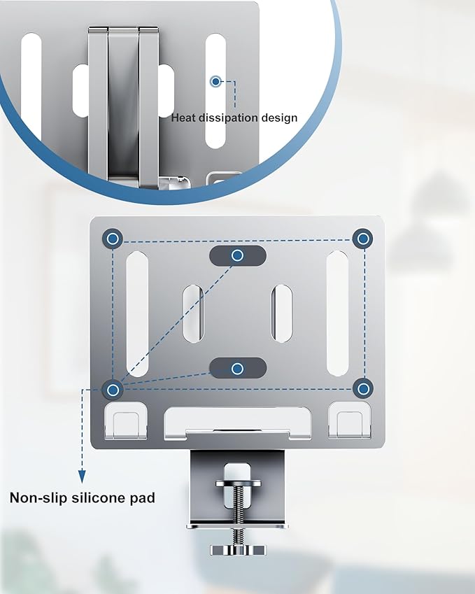 - Clamp Design & Integrated Design: This laptop arm for desk can be mounted by adjusting the width of the bottom clamp to fix it, easy to install; When using, clamp the collet to the edge of your furniture, and then adjust the height and angle of the laptop tray stand to suit your viewing angle (The light will make the metal bracket display slightly different colors, with gray being more pronounced under strong light )