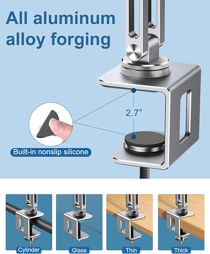 - Widely Applicable: The adjustment range of the clamp is 0-2.7 " , which can be used on cylindrical, glass, thick and thin tabletops; It is also suitable for laptops, books, tablets, projectors, and can be given as gifts to family, friends, and colleagues