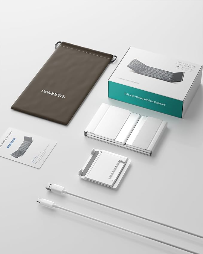- 【Little Things & Big Convenience】 Samsers portable folding keyboard, only 9.3 ounces. Palm-sized keyboard can be folded up magnetically and put in your briefcase without taking up much space. Maximum convenience for you with minimum weight and size! Comes with a phone stand and a velvet storage bag, the perfect companion for a folding keyboard. Not just a keyboard, but a travel solution!