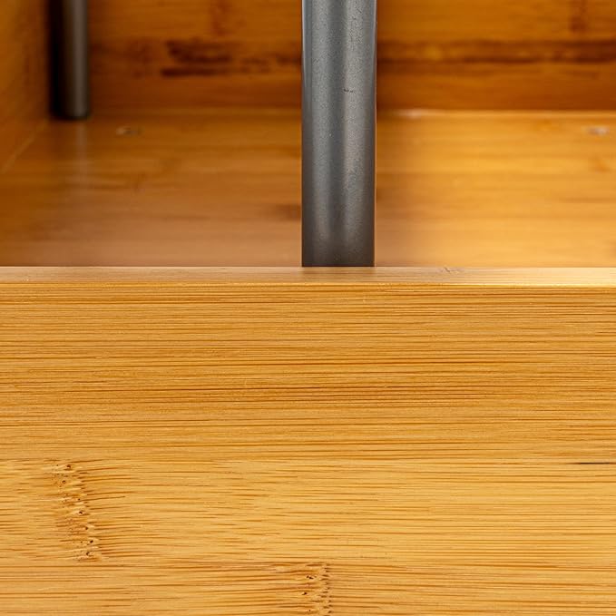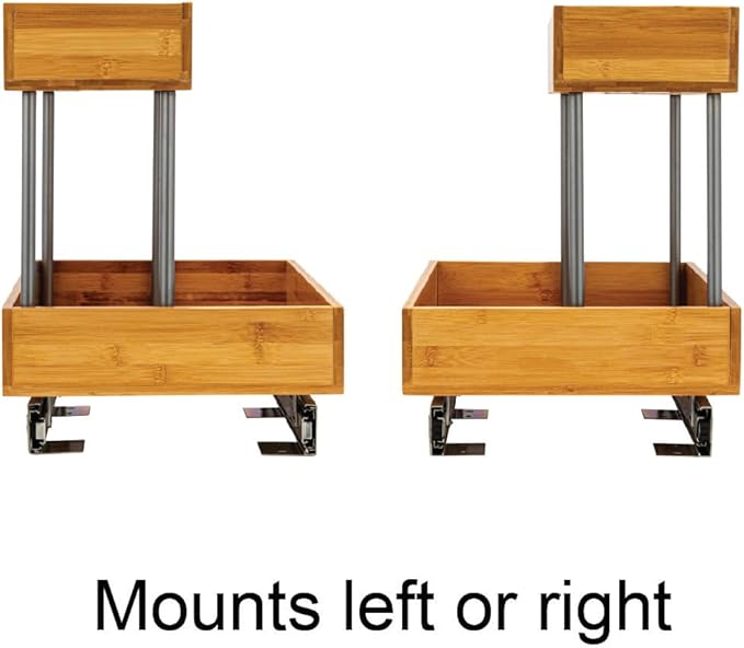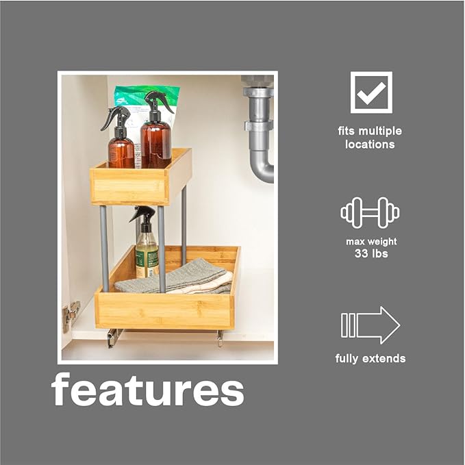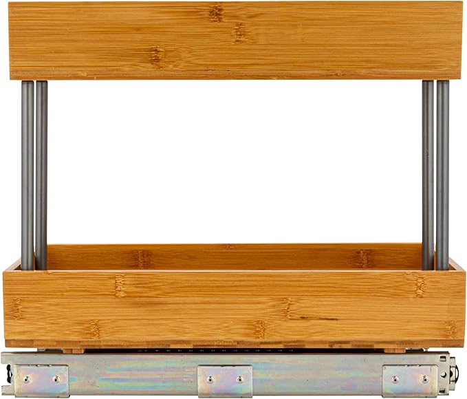 - This cleverly designed, durable chrome-plated steel and natural bamboo organizer is crafted to accommodate sink pipes or taller essentials with a narrow top tier and full-sized bottom tier; Equipped with an easy-mount full-extension sliding base
