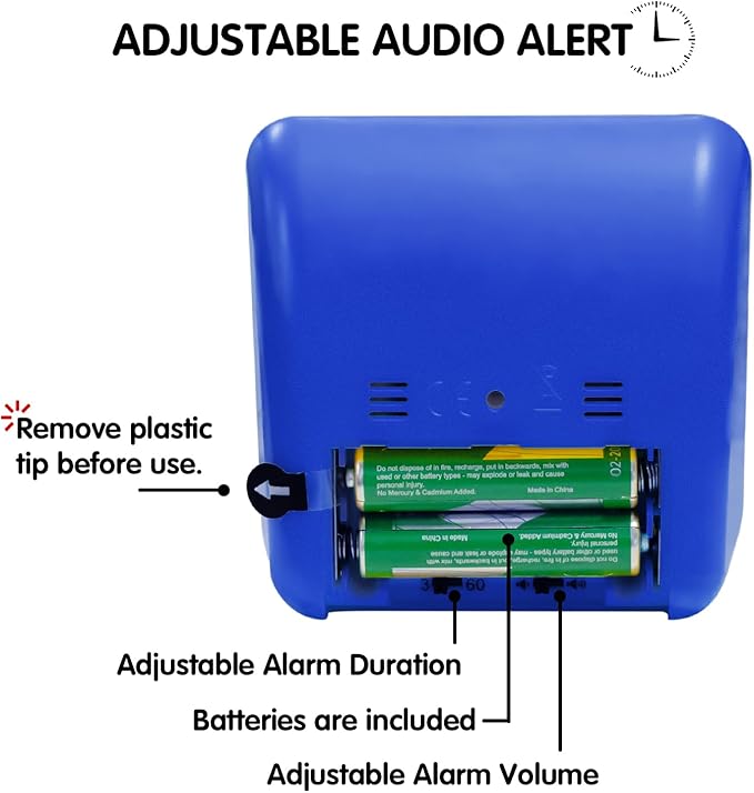 - š[ Adjustable Audio Alerts ] Volume and duration of the alarm are both adjustable: 3 seconds or 60 seconds for alert duration, low or loud for alert volume. The timer does not audibly tick, allowing you to focus on your tasks.