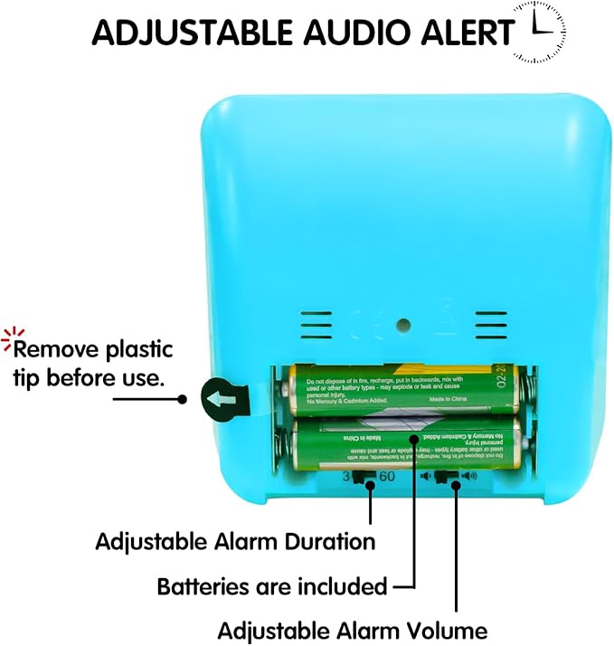 - š[ Adjustable Audio Alerts ] Volume and duration of the alarm are both adjustable: 3 seconds or 60 seconds for alert duration, low or loud for alert volume. The timer does not audibly tick, allowing you to focus on your tasks.