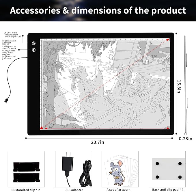 - 【THE OVERSIZED A2 LIGHTBOX】with dimensions of 23.7''x15.8''. The illuminated area measures 20.8''x14.0''. Its thickness is only 7mm, which is less than 0.3 inches. YINGWOND light board provides a sufficiently large working area for various creative activities such as diamond painting, vinyl weeding, stenciling, 2D animation, and calligraphy.