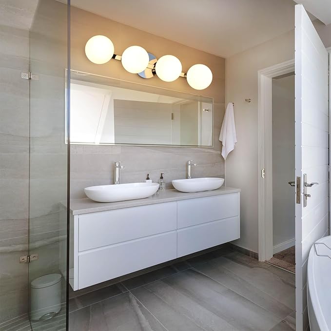 Globe Bathroom Vanity Light Fixtures, Modern 4 Lights Wall Lighting Chrome, Porch Wall Mount Light Fixture for Bathroom, Over Mirror Cabinets Hallway Stairs