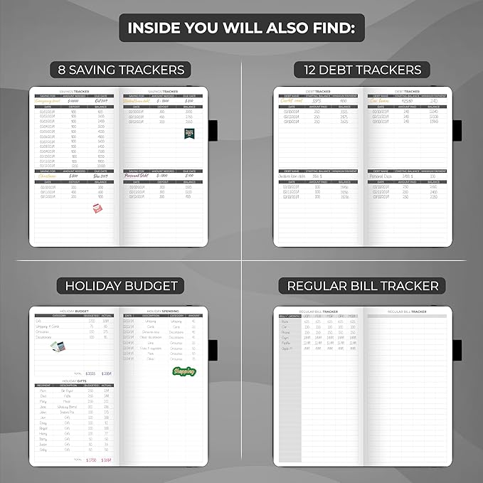 - Effortlessly Manage Spending, Debts, and Savings – This 12-month finance planner features an undated format with monthly calendars, budget plans, expense trackers, 8 savings and 12 debt trackers.