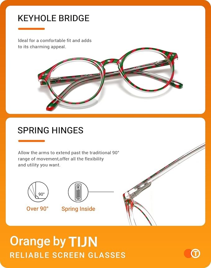 - Premium Materials; High-quality acetate materials are used in these non-prescription glasses; TIJN circle blue light glasses passed the CE certification, lightweight and durable; Other more, there are flexible spring hinges are used in our glasses frame, which allows the arms to extend over the traditional 90°range of movement, offers all the flexible and utility you want