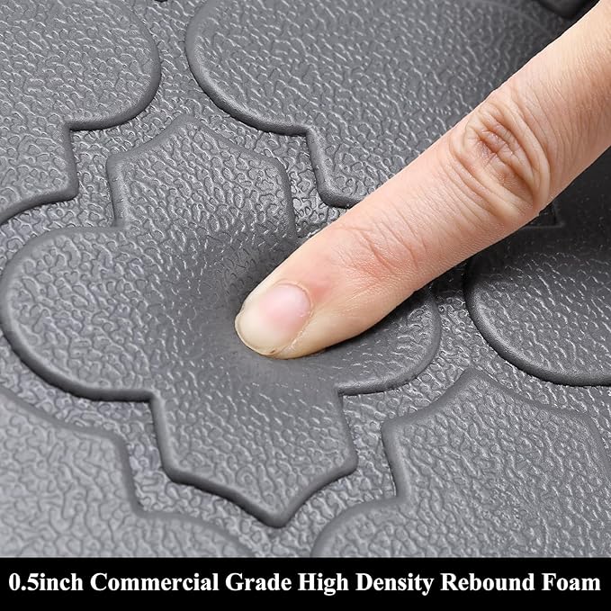 - Thick Cushioned Antifatigue Floor Mat: HEBE anti-fatigue kitchen floor mat provides thick, cushioned support to help improve circulation and posture alleviates stress, to ensure that you are able to stand comfortably while working in the kitchen or at any work station. Perfect for hair stylists,cooks and anyone who stands for long periods of time;