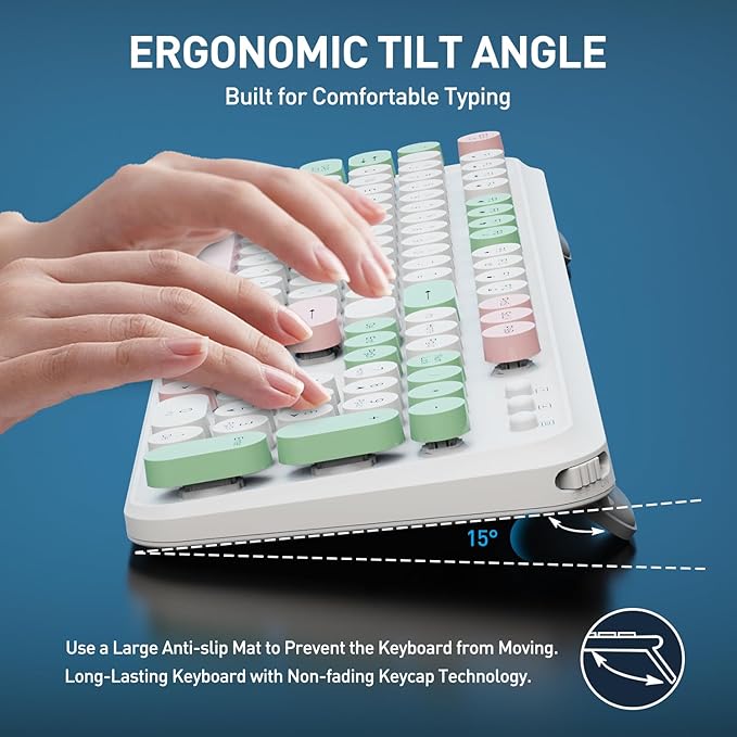 - Special Feature : Auto Sleep Mode, Colorful Typewriter Keyboard, Ergonomic, Foldable Tilt Legs, Round Keycaps
