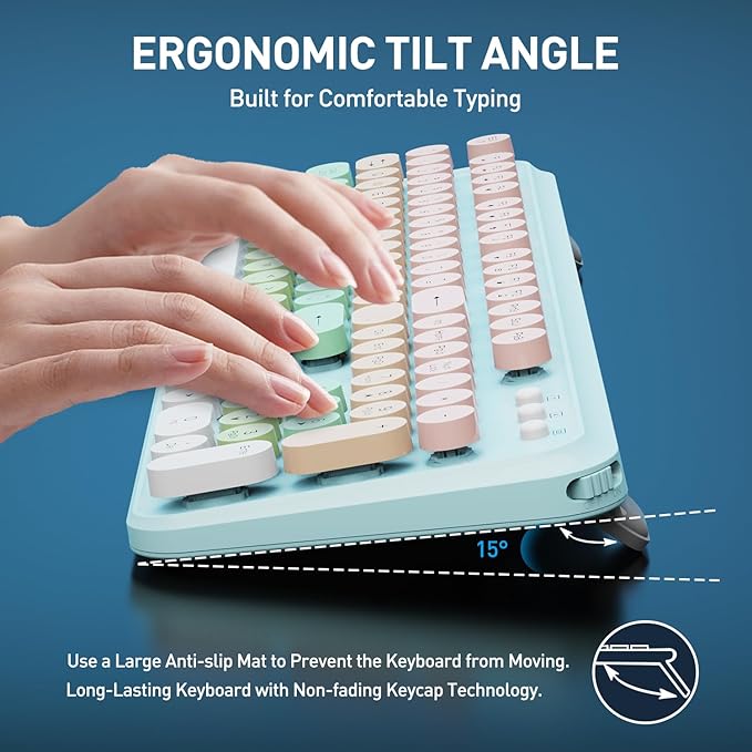 - Special Feature : Auto Sleep Mode, Colorful Typewriter Keyboard, Ergonomic, Foldable Tilt Legs, Round Keycaps
