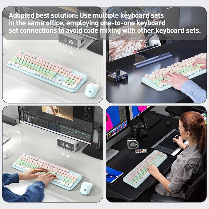 - 【School Essentials & Desk Accessories】 The colorful round button keyboard and mouse set greatly improves work efficiency. A good choice for your Christmas, birthday, Valentine's Day or New Year gift list. The quiet keyboard and mouse is also perfect for office cute desk accessories or home workers. The mouse requires one 1.5V AA battery (INCLUDED) and keyboard requires two 1.5V AAA battery (included).