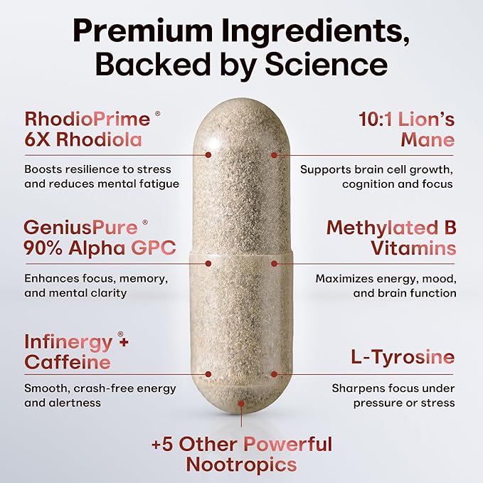 Nootropic Strongest Focus Supplement - Clinically Backed Ingredients Made in USA - Scientifically Backed Doses - Supplement for Brain Fog - AlphaGPC, Lions Mane, Rhodiola and More 10:1 90 Capsules