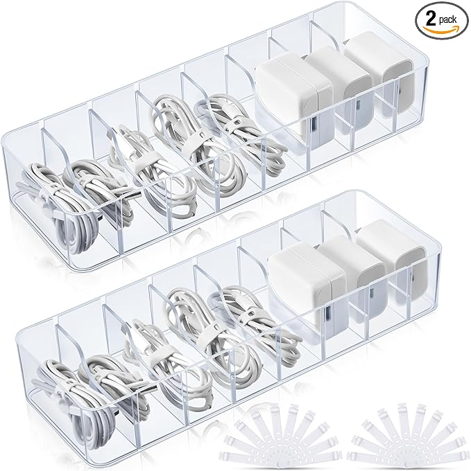 Tatuo 2 Pcs Cable Organizer with 20 Wire Ties, Plastic Cord Storage Charger Box Electronics Organizer with Adjustment Compartments Cable Storage for Drawer Home Office Desk Accessories (Clear)