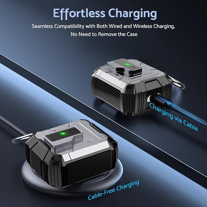 - [Convenient Charging & Portability] The case supports both wired and wireless charging for your Airpods case. The front LED remains visible to show the charging status. An included portable carabiner allows you to conveniently take your Airpods case with you during outdoor activities like climbing, hiking, and travelling.