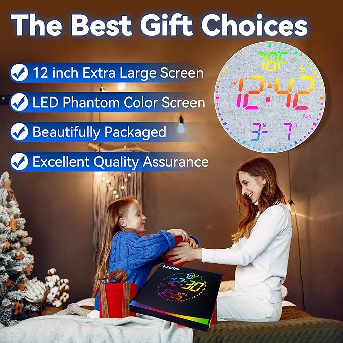 - 🌈 【Large 12-Inch Vivid Color Display】: Immerse yourself in Time, Date, and Temperature at a glance with our expansive, senior-friendly LED display. Its easy-to-read digits cater to all ages, with 12 vibrant RGB colors allowing you to personalize your space. Adjust the brightness for a perfect display and add both functionality and a decorative touch to your surroundings.