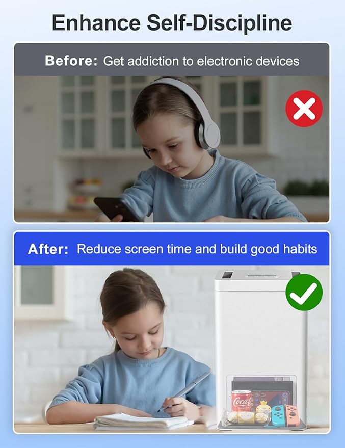 - 【Self-Control and Discipline】Have trouble with addiction with smoking, alcohol, medication and electronics? Wanna cut back on your own or children’s screen time and overeating? You need this time lock container! You can lock up cellphones/iPad mini/snacks/cigarettes/medicine/keys/cash/game console/tv remote, etc. It works like a charm to help you resist those temptations, enhance your willpower and self-control.