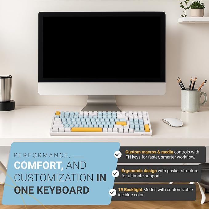 Qisan Wireless/Wired Mechanical Keyboard, Triple Mode 2.4G/USB-C/BT Wireless Gaming Keyboards, 100 Keys (98%) US Layout Red Switch Rechargeable Ice Blue Backlit Keyboard | Blue, Yellow & White