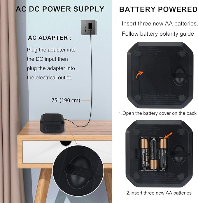 - [Plug in or Use battery for White Sounds Machine] – The sleep noise machine is powered by an included AC adapter with a micro USB cable or 3 AA batteries (Not included), making it an easy portable solution for home, office and travel.