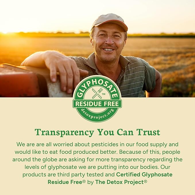 - CERTIFIED CLEAN, SAFE & PURE : Our rigorous attention to quality guarantees that consumers can trust the products they choose. Clean Certified to meet non-GMO, nutrient density, and ethical standards. Third-party tested in ISO-accredited labs for purity and contaminants, including verification of gluten-free and soy-free status. Certified by The Detox Project to be free of glyphosate herbicide residue.*