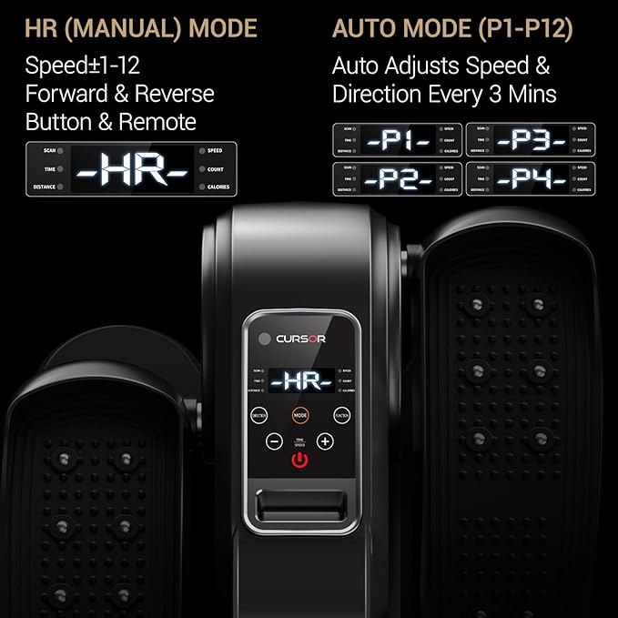 - HR & Auto Mode: Exercise anytime, anywhere. In HR(Manual) mode, you can adjust workout time(15-30min), speed(1-12) and direction (forward&reverse) by remote control or button of the elliptical machine. Then switch "mode" to Auto mode that the speed and direction have been programmed. In auto mode, you can adjust P1-P12 mode by press mode button, the speed of the mini seated elliptical changes every minute, and the direction changes every 3 minutes